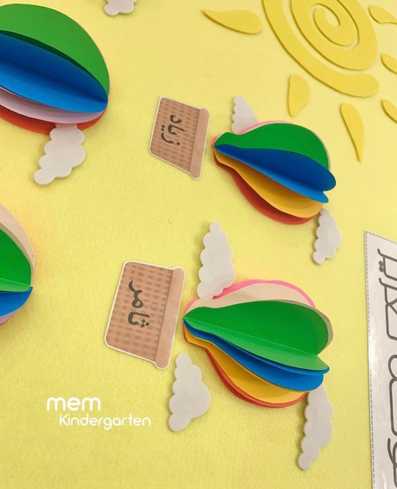 تقوم المعلمة بكتابة اسم الطفل على سلة المنطاد ، يتم تعزيز السلوك الإيجابي لكل طفل عن طريق وضع غيمة بجوار المنطاد الخاص بالطفل