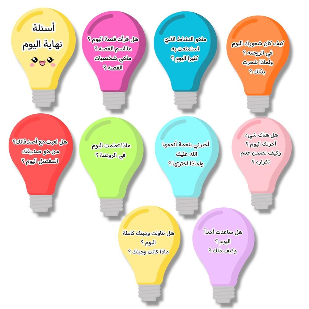 تحتوي هذه البطاقات على أسئلة نهاية اليوم مخصصة لأطفال الروضة، تساعد المعلمة في مراجعة نشاطات الطفل وتقييم يومه بطريقة ممتعة ومنظمة