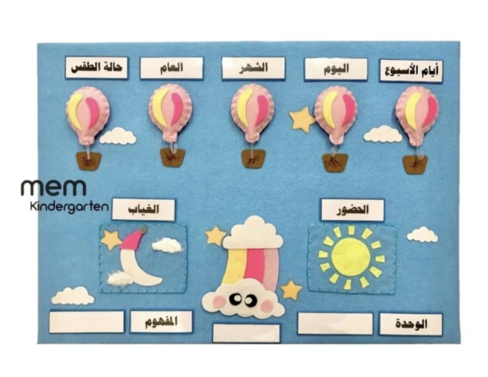 تحتوي اللوحة على أقسام مخصصة لعرض : أيام الأسبوع - التاريخ - الشهر - العام - حالة الطقس - الحضور والغياب - الوحدة - المفهوم